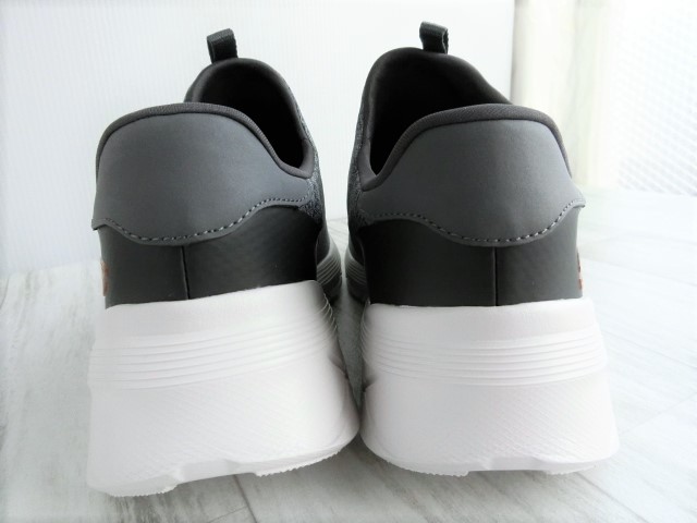 チャコールグレーのヘザー調(霜降り調)ニットアッパーは、スポーティーでありながら落ち着いた印象を与えます。これならジーンズやチノパンなど、普段の服装にもすんなり溶け込んでくれそうです。シューレースは結ぶ必要のないバンジーコードタイプで、デザインのアクセントにもなっています。
