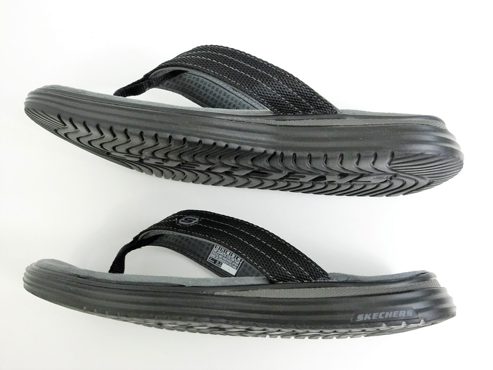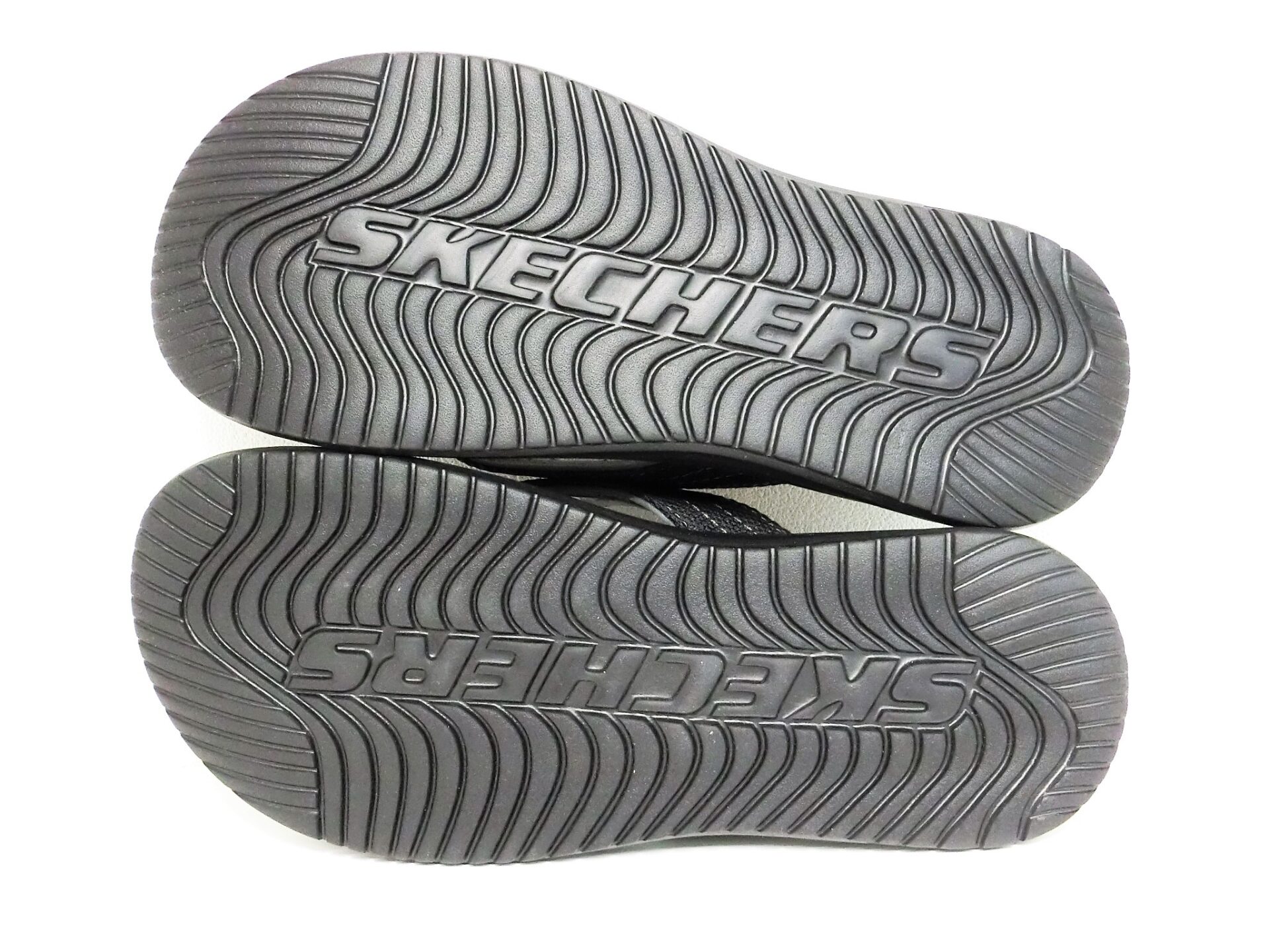 波のような独特なパターンが刻まれたアウトソールは、地面をしっかりと捉え、優れたグリップ力を発揮してくれます。濡れた路面やちょっとしたアウトドアシーンでも安心して歩けそうですね。中央には大きく「SKECHERS」のロゴがデザインされており、見えない部分にもこだわりが感じられます。